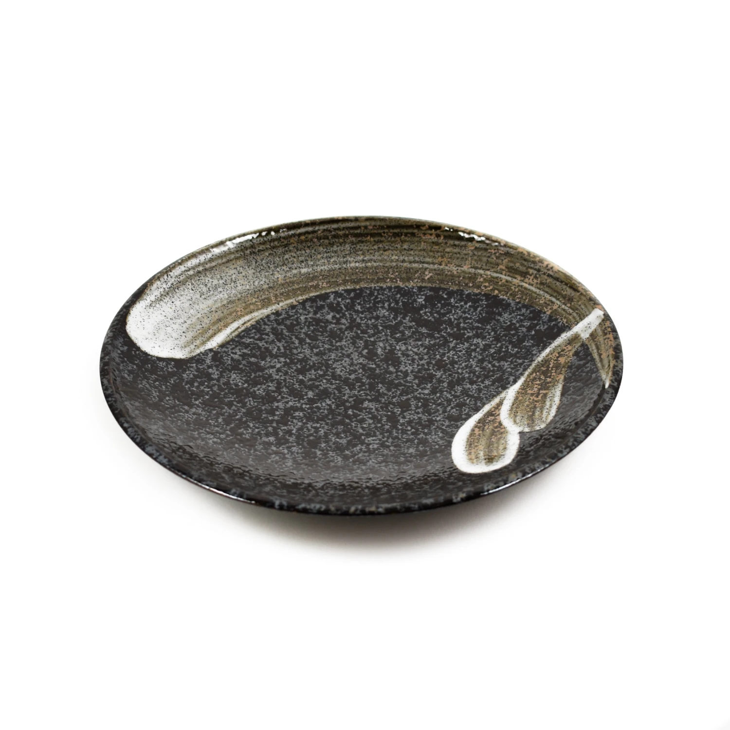 “Karasuba-iro” means glossy black in Japanese, and this glazed ceramic plate has a beautiful glossy black and grey speckled surface. Additional red-brown detailing and white sweeps add to the elegance of the design.