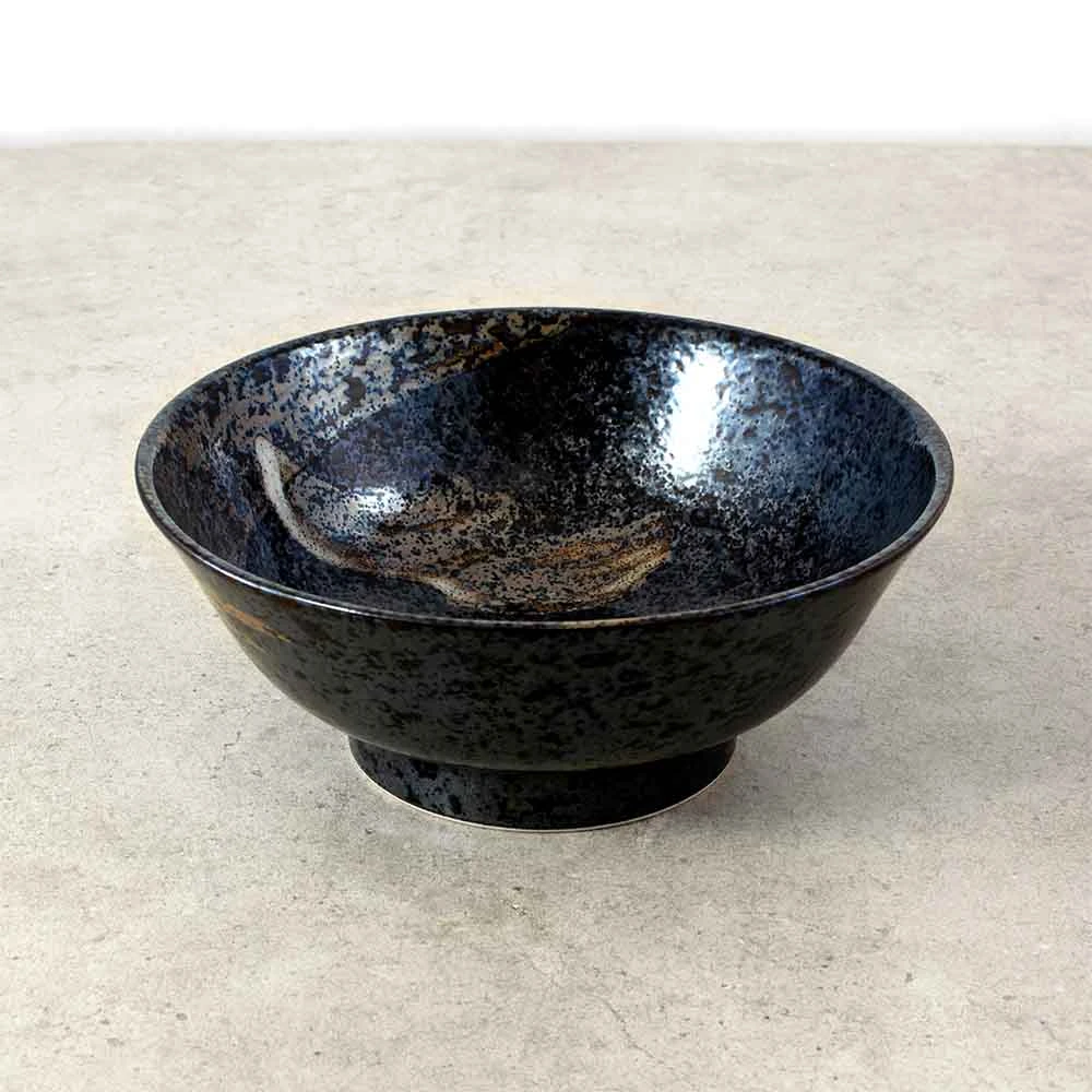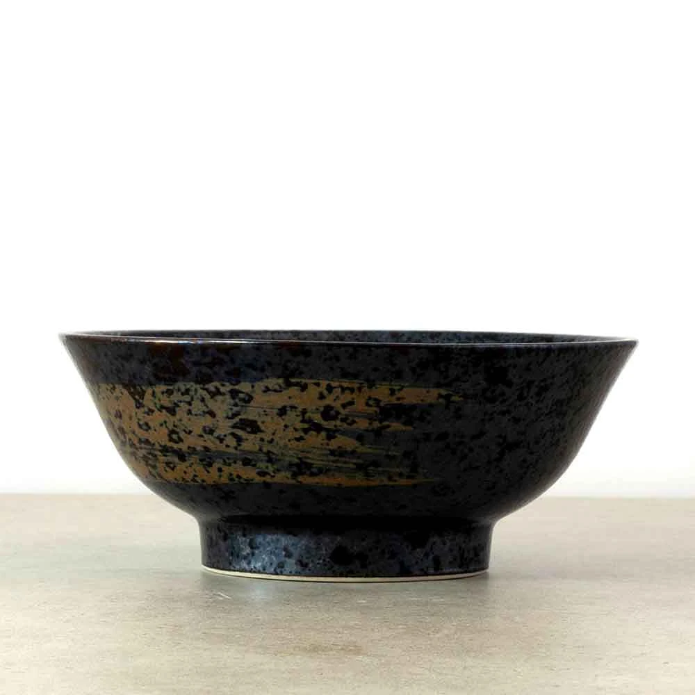 “Karasuba-iro” means glossy black in Japanese, and this glazed ceramic ramen bowl, has a beautiful glossy black and grey speckled surface. Additional red-brown detailing, and white sweeps add to the elegance of the design. This shape and size of Japanese bowl is perfect for serving noodle or ramen dishes.