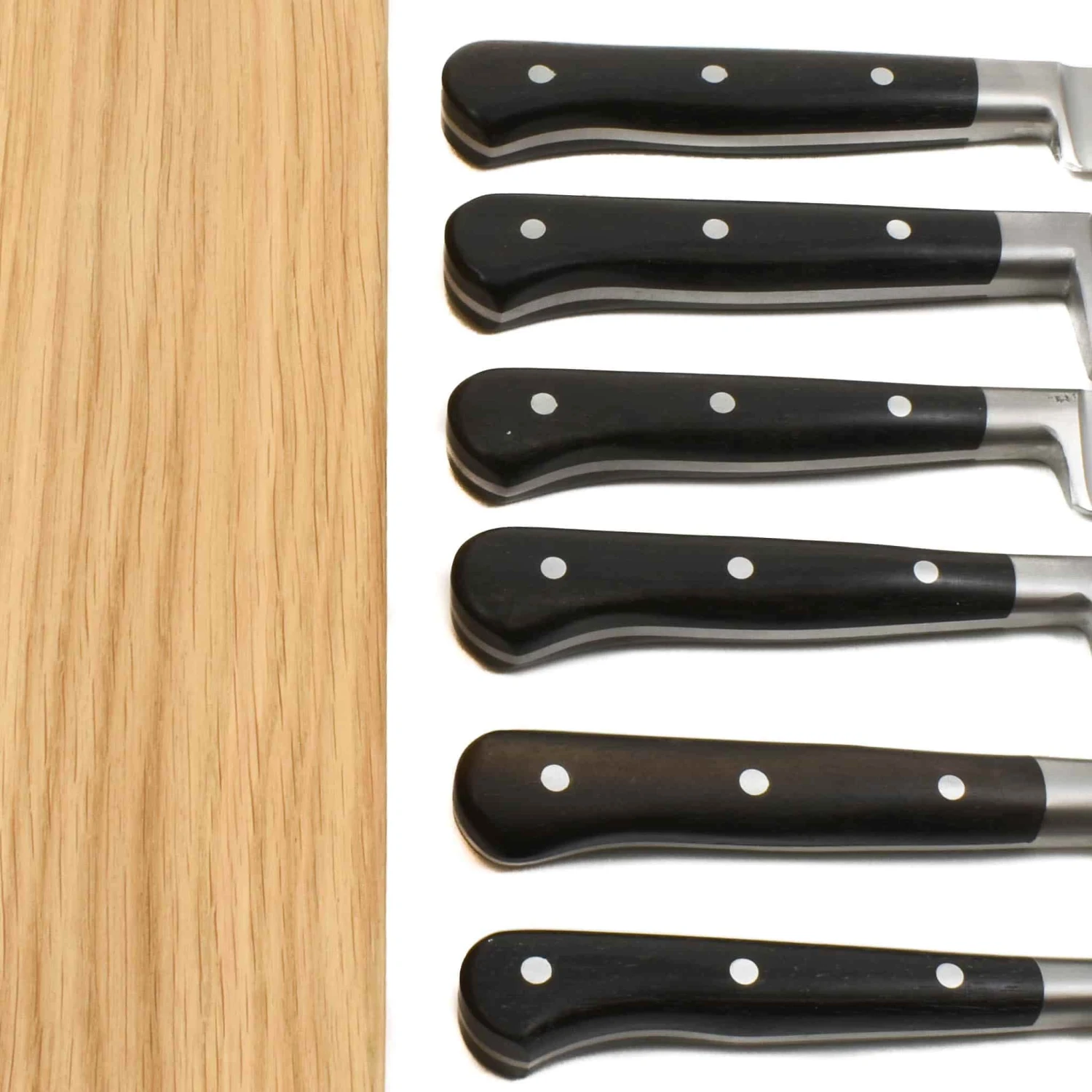 The Laguiole en Aubrac classic knife block with 6 ebony-handled kitchen knives is a stunning display of knive. Each stainless steel knife has a beautiful Ebony wood black handle that looks elegant and classic in any kitchen. The magnetic oak wood block makes a stylish display for this brilliant starter knife set.Â