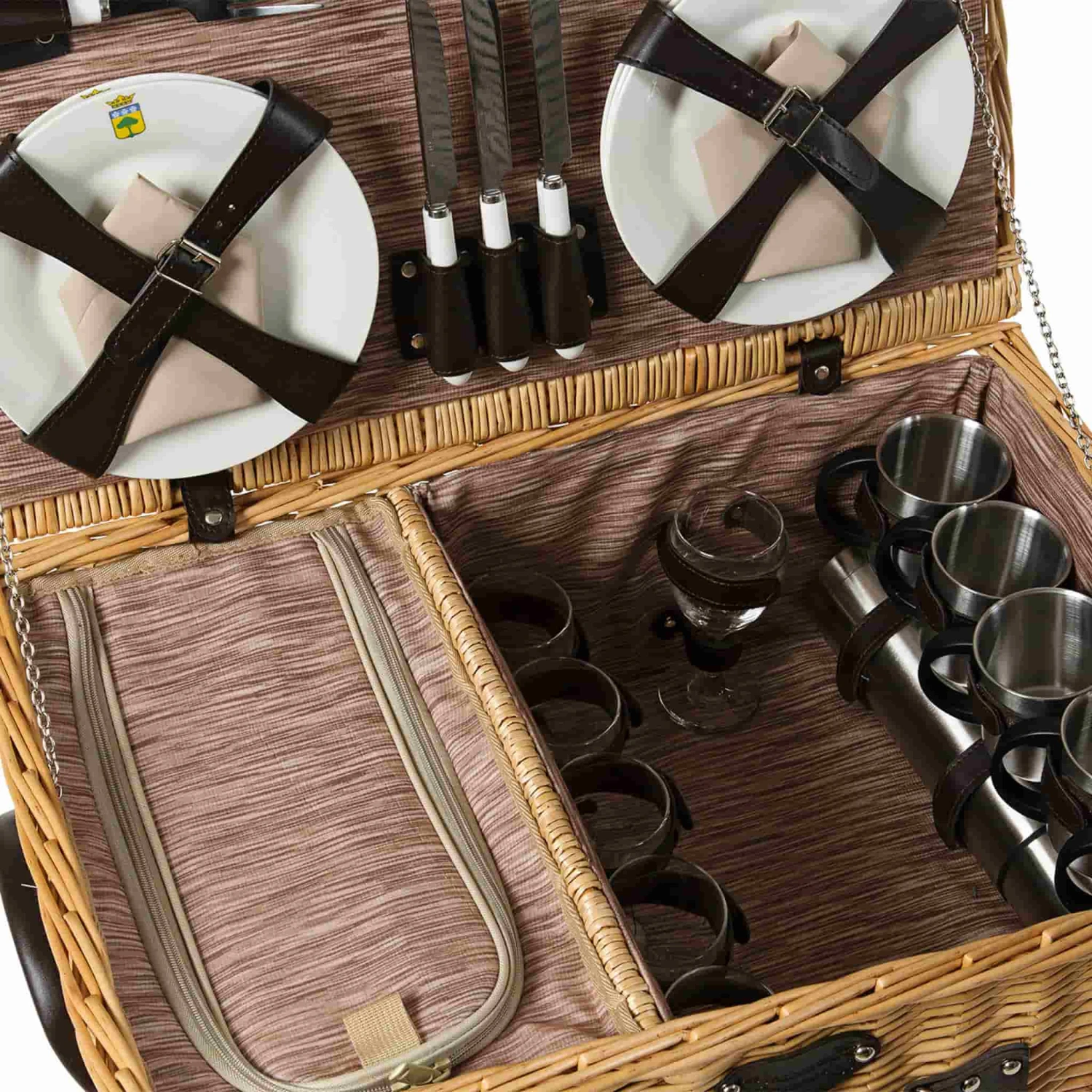 The Louvre picnic basket contains elegant glasses for cocktails and sparkling wine, as well as a thermos for post-picnic coffee. All the little details are taken care of, from salt and pepper shakers to a handy bag for storing dirty dishes. Use it to transport a homemade afternoon tea or a fabulous feast of salads, sandwiches and fruity desserts.