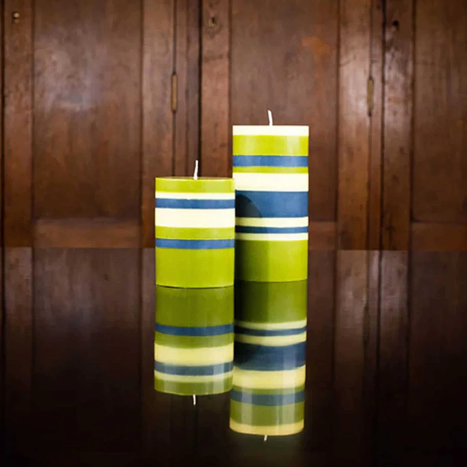 This striped pillar candle in olive and navy is an elegant addition to your candle collection. Designed by British Colour Standard, it is made with high quality eco dyes to produce vibrant shades that will brighten up your mantelpiece or coffee table. This 10cm candle will burn for up to 36 hours with almost no smoke or soot.