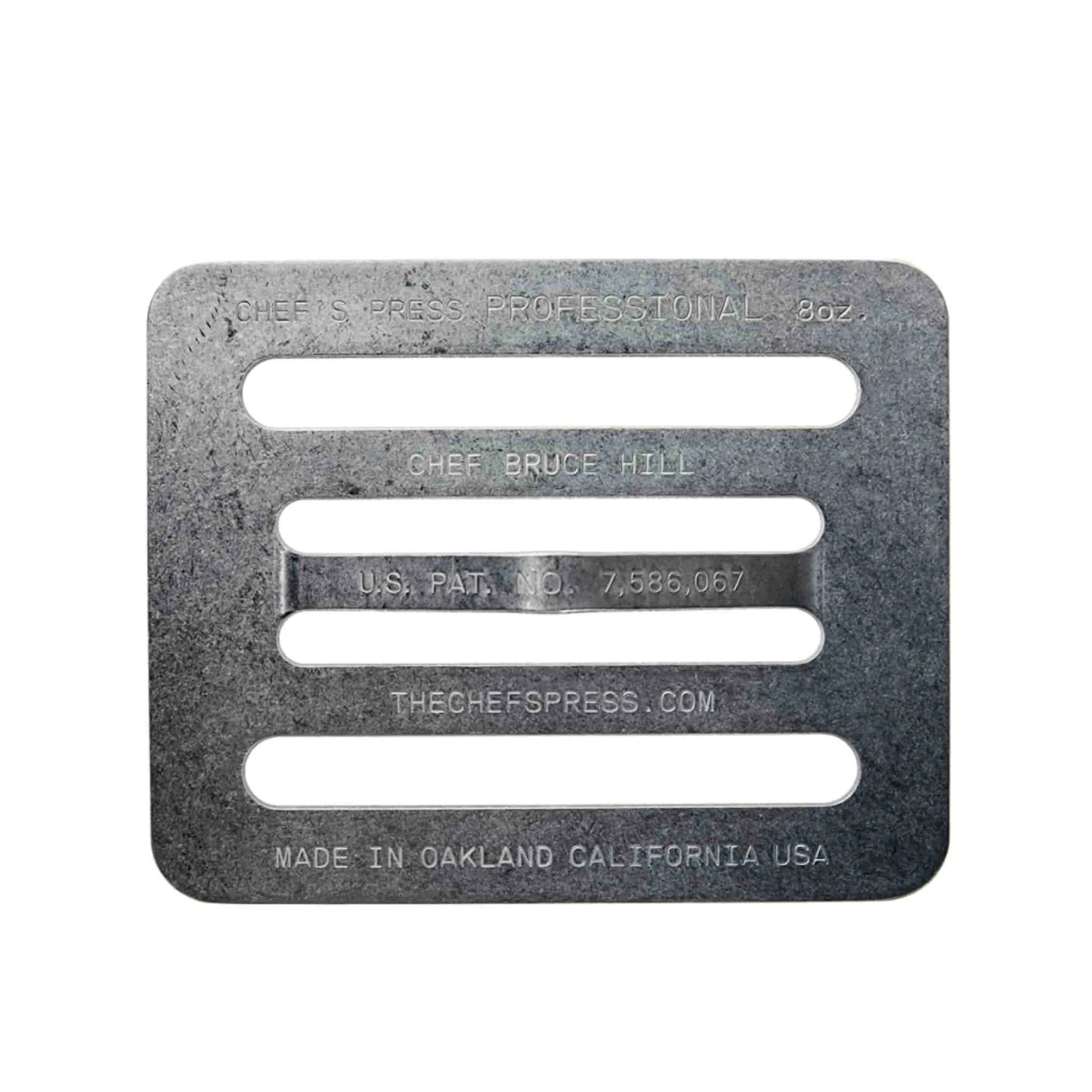 The Chef’s Press was created by Chef Bruce Hill while he was working in a tiny kitchen of Bix Restaurant in San Francisco. The traditional cast iron weights were too heavy for many dishes and also trapped steam.